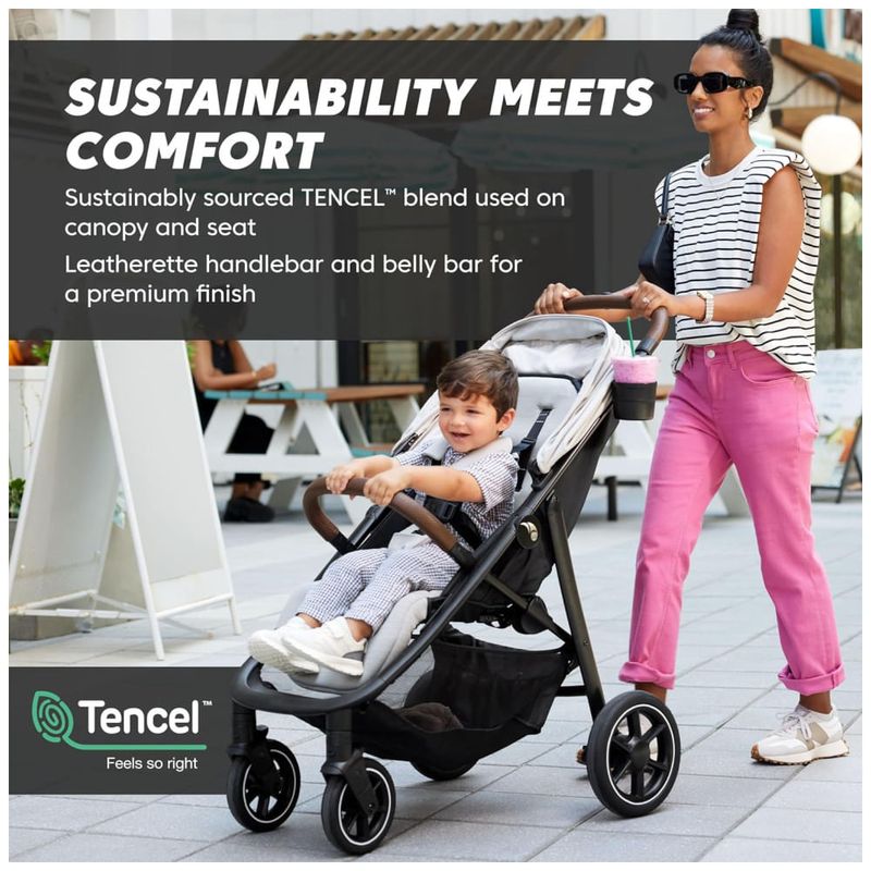O guidão ajustável e a barra de barriga são revestidos com couro sintético premium, proporcionando elegância e estilo ao carrinho. A estrutura de alumínio é compacta, dobrável e leve, facilitando o transporte e armazenamento. O arnês do carrinho Harness Assist sem rosca permite que você ajuste o ajuste do arnês sem recauchutagem e uma fivela magnética entra e sai rapidamente.