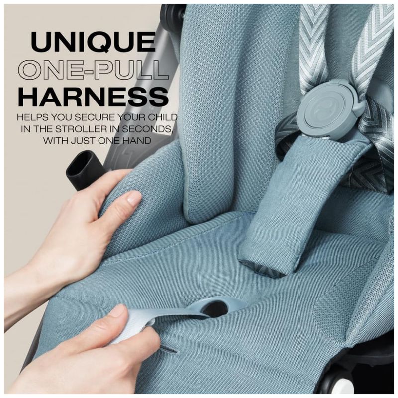 A cadeira de bebê pode ser facilmente ajustada com uma mão para proporcionar conforto personalizado ao seu filho, enquanto o cinto de puxação único ajuda a prender seu filho no carrinho em segundos. A unidade de assento reversível pode ser facilmente posicionada de frente para os pais ou para frente, e senta se corretamente na altura da mesa para tornar as refeições fora de casa convenientes.