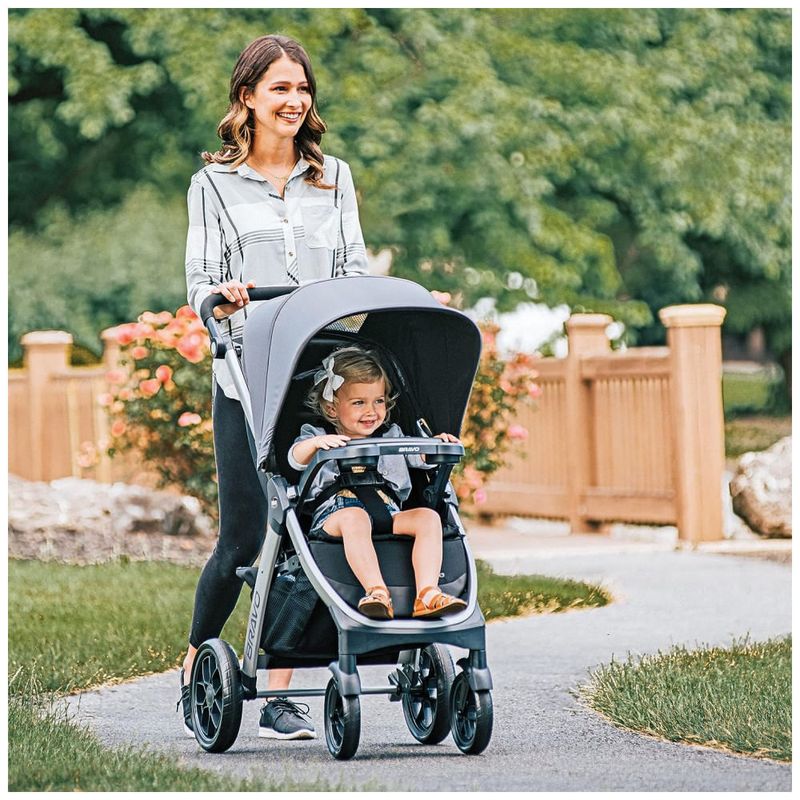 O Bravo Stroller apresenta rodas grandes e elegantes com pneus de banda de rodagem e suspensão nas quatro rodas para navegar em terrenos irregulares. Os freios de pé traseiros prendem o carrinho com um simples toque e a alça de pressão de várias posições ajusta a altura para o conforto dos pais. A grande cesta de zenamento possui 2 bolsos organizadores, laterais de malha para visibilidade e fácil acesso frontal e traseiro