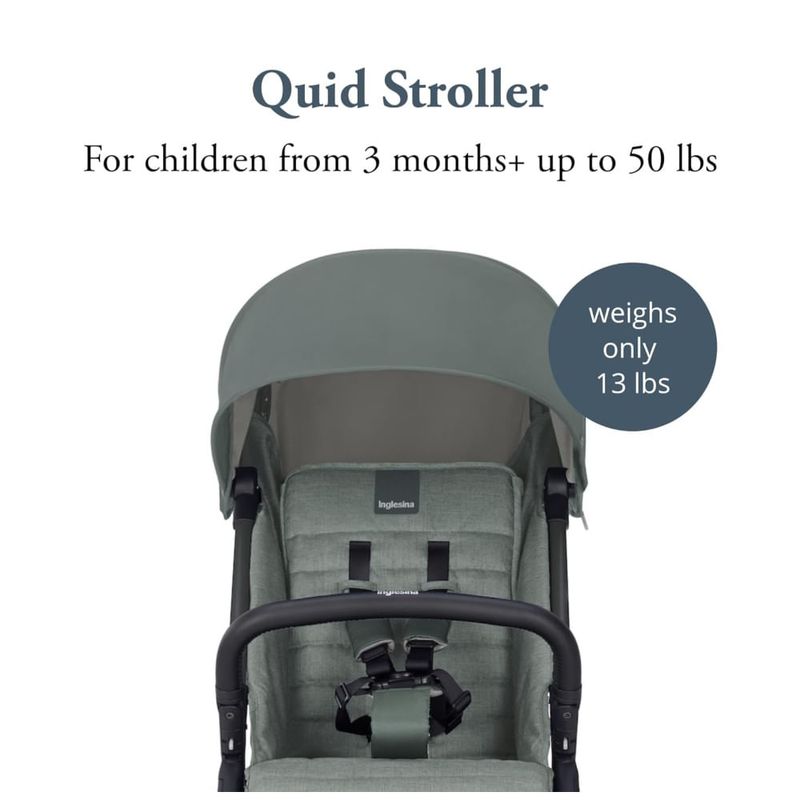 O carrinho possui uma cesta de armazenamento espaçosa e é equipado com um arnês de segurança de 5 pontos e material reflexivo para maior segurança e melhorar a visibilidade à noite. O Quid é compacto, fácil de abrir e dobrar, e possui uma alça de transporte conveniente. Como todos os produtos Inglesina, não contém BPA, chumbo e ftalatos.