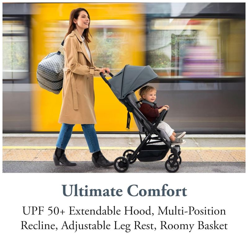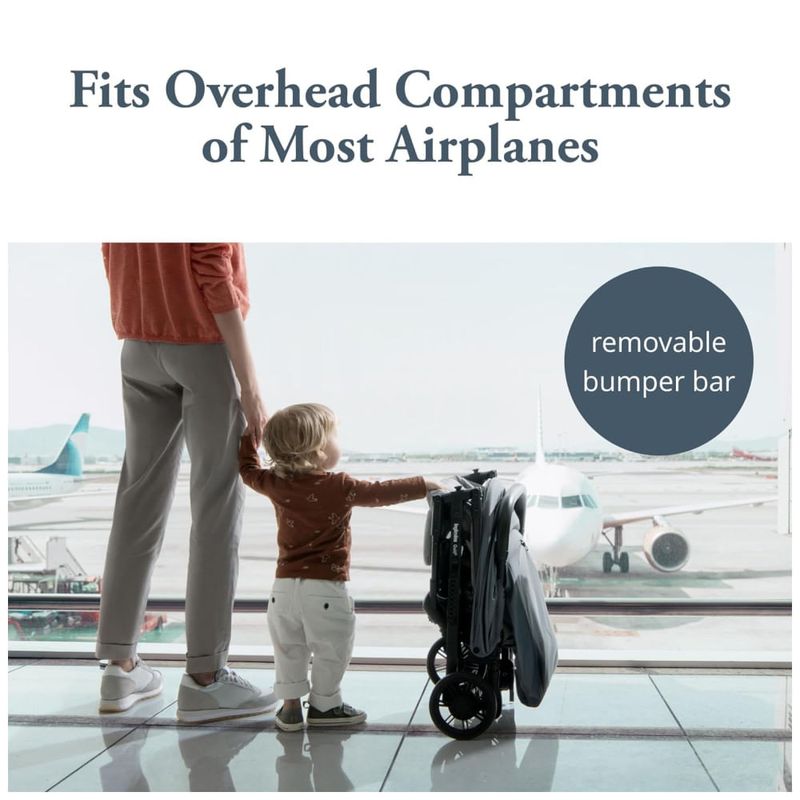 A barra do para choque dianteiro pode ser facilmente removida ou aberta, permitindo que seu filho se acomode facilmente no lugar. Este carrinho de viagem perfeito facilita o transporte graças à sua alça lateral.