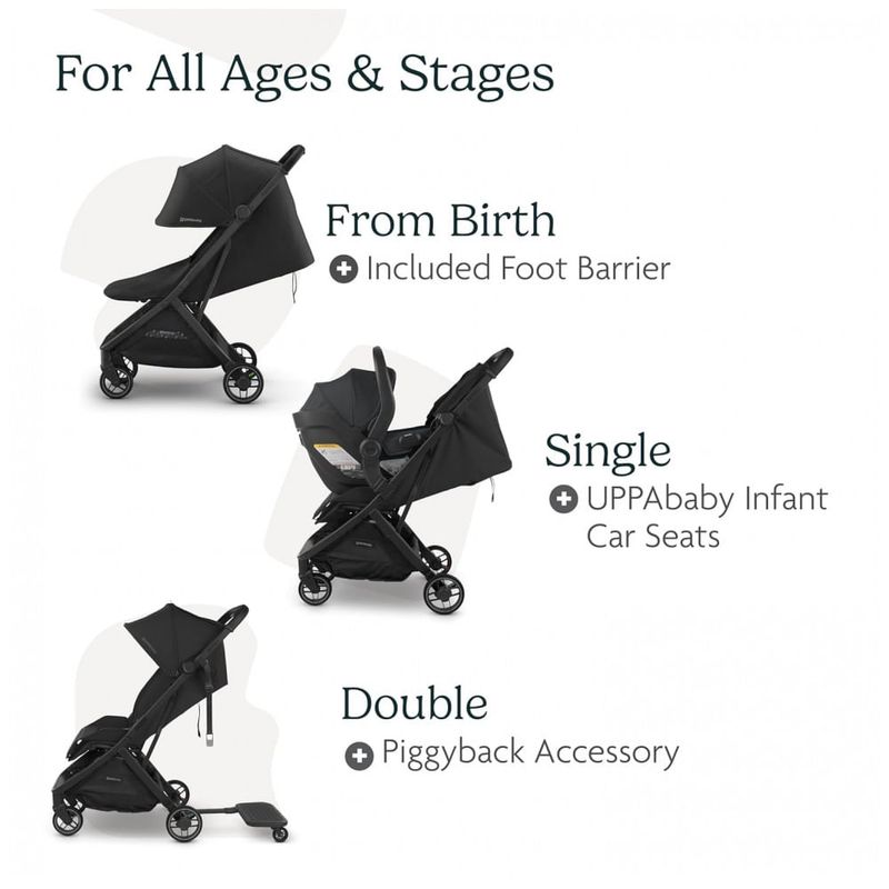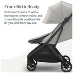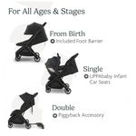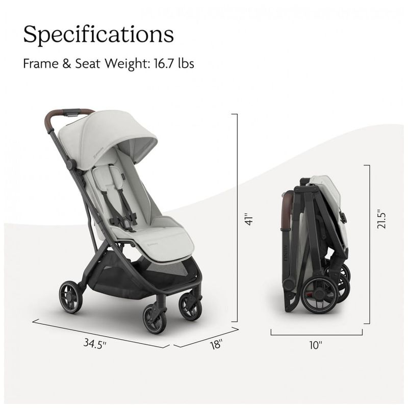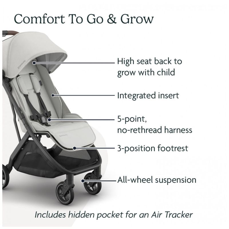 Recursos adicionais: Dobrável com uma mão, compatível com assentos de carro, capota extensível com proteção UPF 50+ e janela de ventilação, inserto acolchoado integrado, cesto inferior com capacidade de até 9 kg, alça de transporte integrada, certificação GREENGUARD Gold