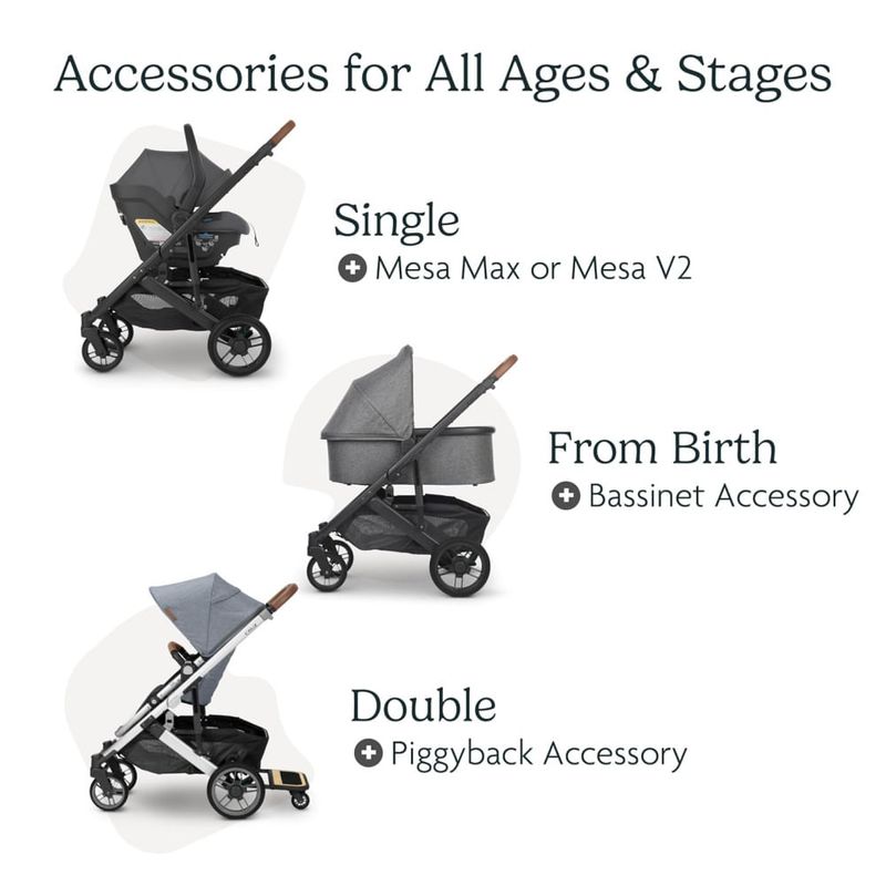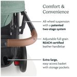 O assento de criança é voltado para frente e para trás, com maior altura das costas, apoio para as pernas e pés mais profundos, além de reclinação multiposição com uma mão. O carrinho possui rodas maiores para um passeio suave, trava de roda fácil de usar com indicador visual de travamento, guiador telescópico de um botão, barra de para choques giratória para fácil carregamento e cesta extragrande e de fácil acesso com capacidade de até 13,61 quilos.