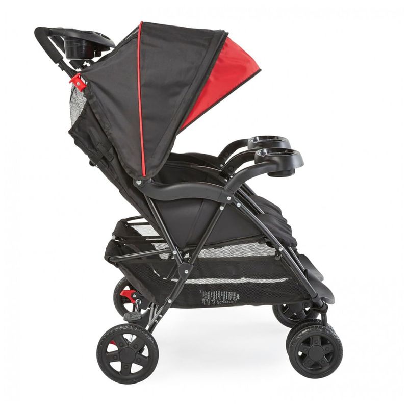 ZENAGEM DE SALA Inclua uma bandeja dos pais com dois suportes para bebidas, bandejas removíveis para crianças com suporte duplo para copo e caixa de suco. Duas cestas de zenamento grandes e de fácil acesso atendem a todas as necessidades do bebê