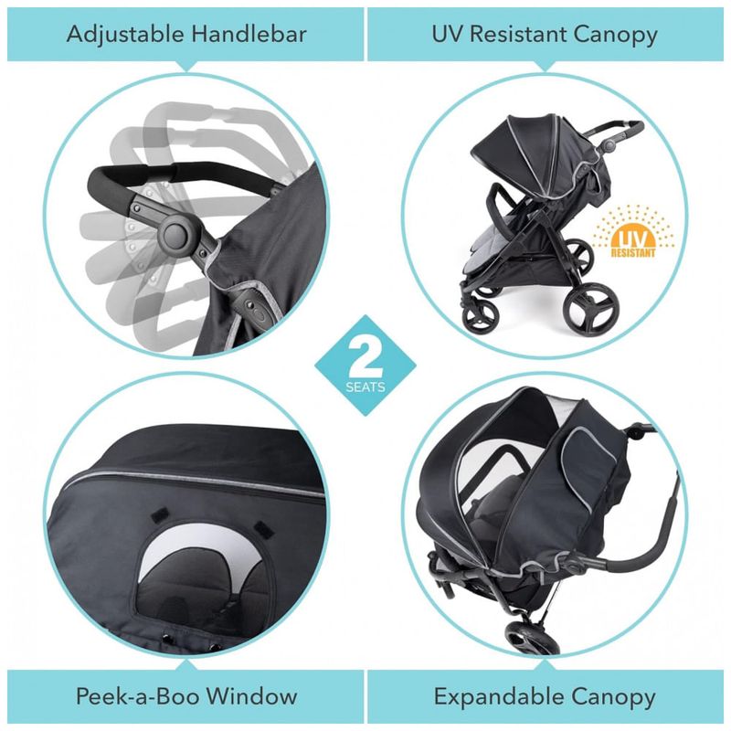 Proteção solar O carrinho de guarda chuva duplo possui um dossel solar grande e expansível, bloqueador de UV, para proteger as crianças enquanto andam. O dossel do carrinho se dobra convenientemente para desmoronar quando não for necessário.
