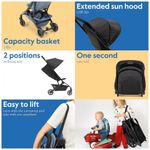 Possui design dobrável compacto com mecanismo de operação rápida e utilização com uma única mão, facilitando o manuseio em deslocamentos urbanos e viagens. A capota é fabricada com material que oferece proteção solar UPF 50+, protegendo a criança dos raios nocivos.
