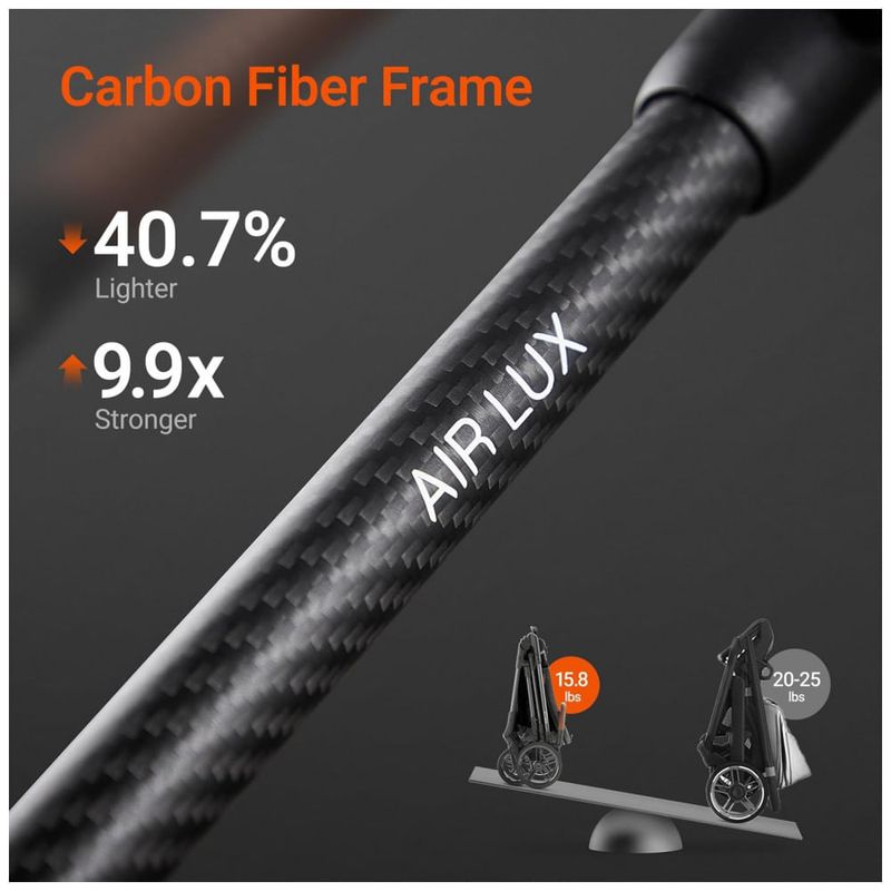 O carrinho MAMAZING Air Lux foi desenvolvido para oferecer alta portabilidade aliada à funcionalidade, pesando aproximadamente 7,2 kg. Seu quadro em fibra de carbono combina leveza e resistência, garantindo durabilidade para uso diário tanto em calçadas urbanas quanto em trilhas de parques.