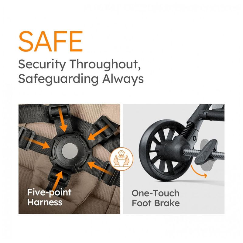 O assento reclina entre 100° e 150°, possibilitando adaptação entre posição sentada e quase deitada, com apoio para os pés ajustável em duas posições. A capota confeccionada em poliéster possui proteção UV UPF 50+ com janela de visualização que permite monitorar a criança sem exposição direta.