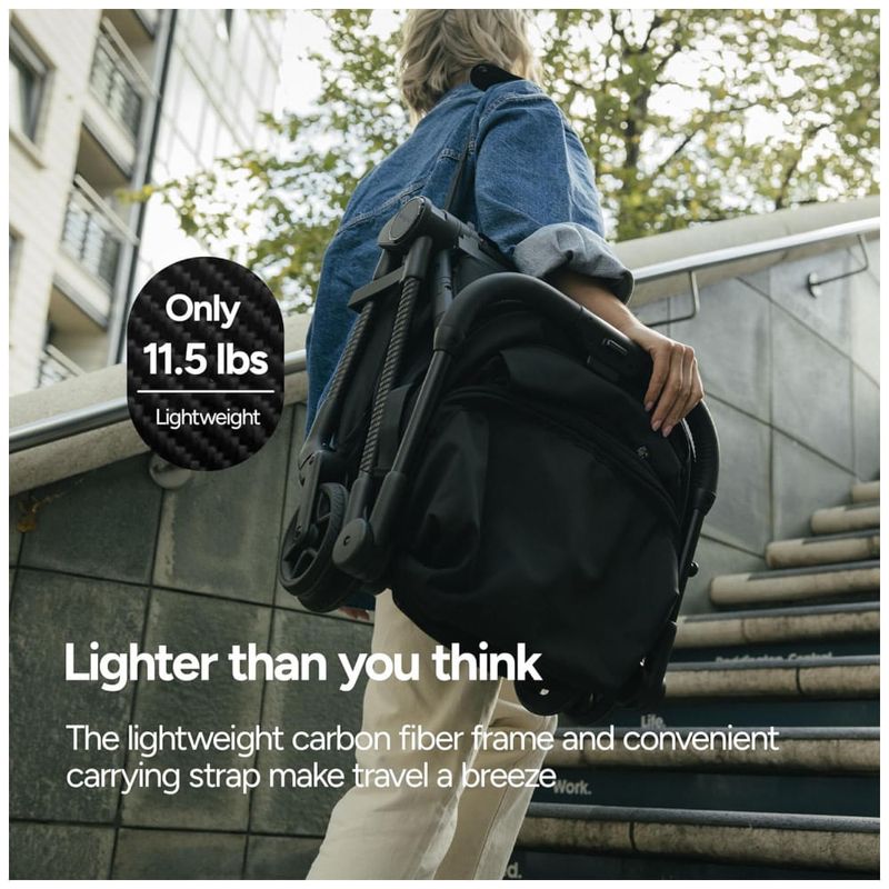 O carrinho Mompush Nexis Carbono apresenta uma estrutura em fibra de carbono de alto módulo, que alia leveza (6,3 kg) e resistência para facilitar o transporte em viagens, sendo compatível com bagageiros de aeronaves. Seu sistema de dobragem automática é acionado com apenas um toque e dobra o carrinho em 1 segundo, liberando as mãos do cuidador.