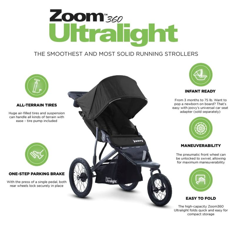 O carrinho vem em quatro cores diferentes e atende aos requisitos de tamanho da Disneylândia e do Disney World. Com um peso de apenas 11,66 quilos, o Zoom360 Ultra light é um dos carrinhos de bebê mais leves do mercado. Construído para durar e projetado para a família, este carrinho de bebê combina qualidade e conforto para permitir que os pais se mantenham saudáveis e felizes, produzindo crianças felizes e saudáveis.