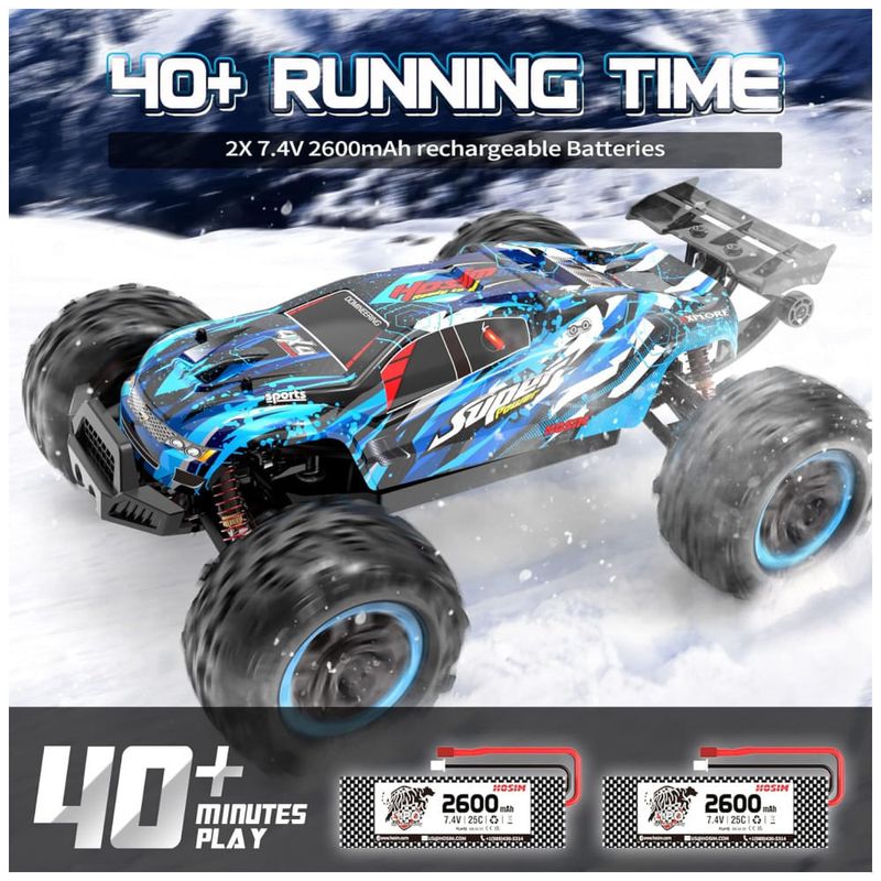 2 Pacotes de Baterias de 2600mAh: O carro RC inclui duas baterias de 7,4V 2600mAh e um conector de bateria duplo, permitindo que você use duas baterias ao mesmo tempo. Isso aumenta o tempo de execução para até 40 minutos por sessão de uso.