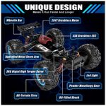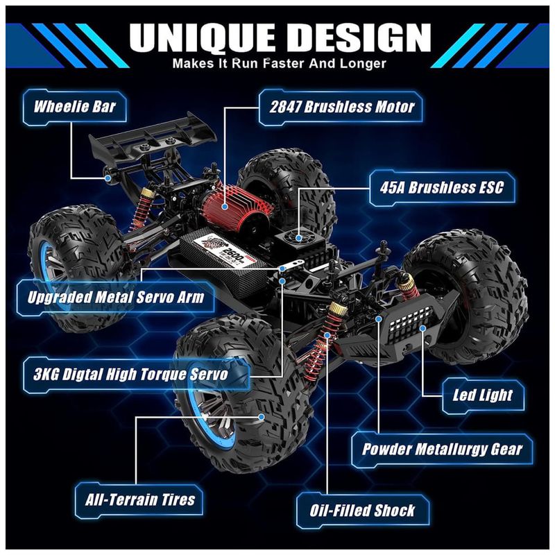 Motor sem escova 2847 e ESC sem escova 45A: Este veículo é equipado com um motor poderoso de 2847, que permite atingir uma velocidade máxima de 68 km, h 40 mph. Além disso, possui um controlador eletrônico de velocidade ESC sem escova de 45A projetado para oferecer máxima conversão de energia. Ele suporta uma bateria 3S 11,1V no máximo bateria de 7,4V 11,1V.