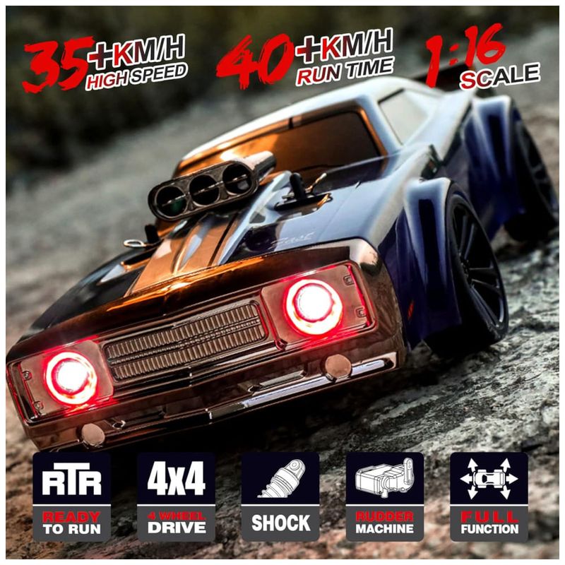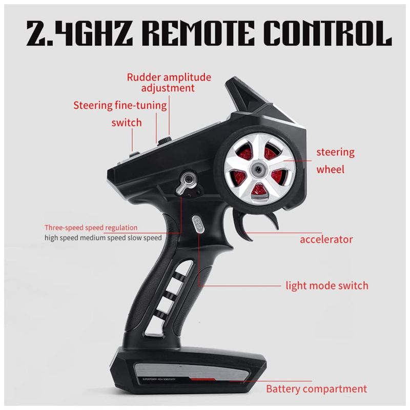 Com sistema 4WD e 390 motores potentes, este carro tem forte potência e força motriz, permitindo que ele conquiste todos os tipos de ambientes hostis ou desvie facilmente na estrada. O tempo de carregamento é de cerca de 3 horas, com tempo de jogo aproximado de 20 minutos. O controle remoto de 2,4 GHz tem operação de frequência de 2,4 GHz, mais estável, longo tempo de execução e maior distância de controle, com emparelhamento automático, podendo controlar até 84,5 metros com alcance de cerca de 85 metros de distância. Existem 3 modos de velocidade, sendo que a velocidade real será diferente de acordo com diferentes terrenos, direção do vento, bateria e medidas.