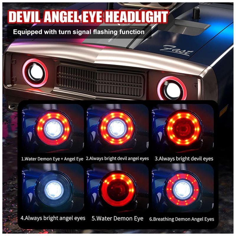 O carro de drift com controle remoto vem equipado com 6 modos de luzes LED, incluindo faróis projetados com olhos de anjo e demônio, e o formato do arco é habilmente combinado com 6 modos de luz. As luzes também possuem função de pisca de direção, com 6 funções de modo olho de anjo de demônio de água, olhos de anjo demônio sempre brilhantes, olhos de demônio sempre brilhantes, olhos de anjo sempre brilhantes, olho de demônio de água, olhos de anjo demônio respiratórios. O design das luzes LED torna o carro ainda mais deslumbrante no escuro.