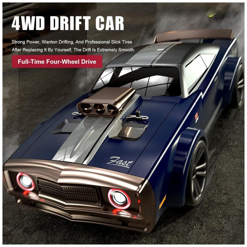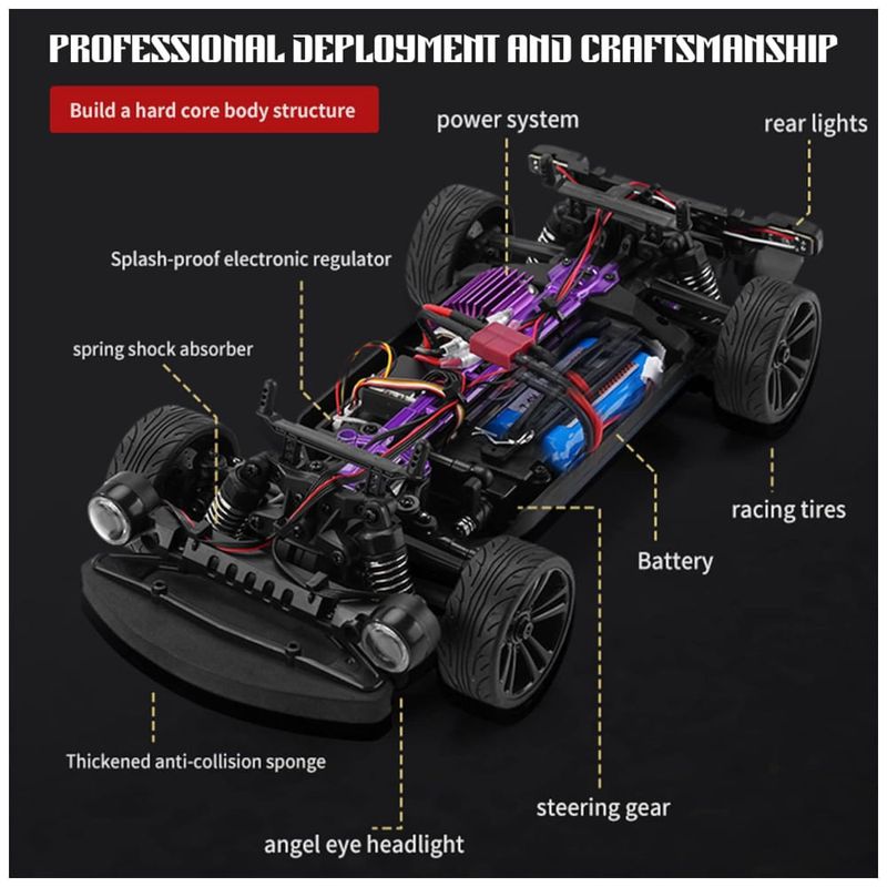 A configuração do carro de drift é perfeita, com proporção e desempenho excelentes, além de um sistema de resfriamento razoável. O motor não é facilmente danificado e o eixo de transmissão de metal torna difícil que você seja danificado durante a condução. A estrutura corporal é rígida e o carro vem equipado com 2 baterias recarregáveis de 7,4, com tempo de carregamento de 3 horas para suportar 20 minutos de reprodução. Pneus também estão inclusos para substituição.