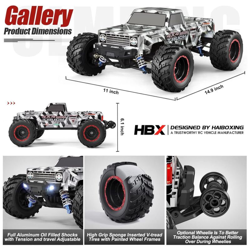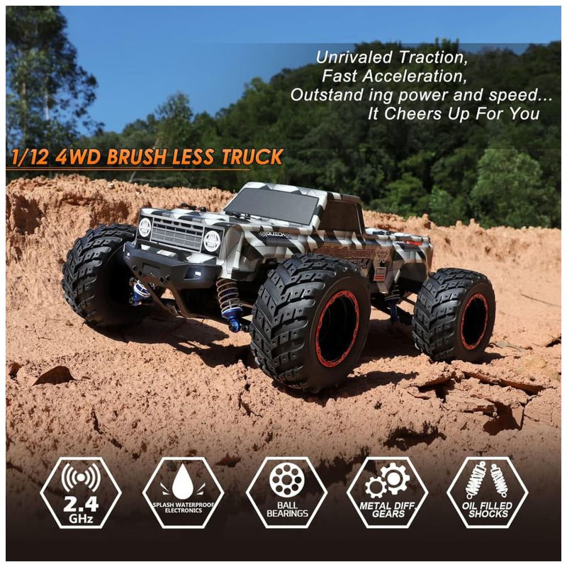 Este carro RC off road possui um motor 2847 sem escovas de 3800KV, pinhões de aço, amortecedores de óleo de alumínio e eixos de transmissão de metal. O chassi com motor posicionado na linha central permite equilíbrio de peso e manobrabilidade estável. Todas as peças de direção foram atualizadas para peças de metal. O sistema de controle de rádio de 2,4 GHz tem um alcance de controle de mais de 100,3 metros, permitindo competir com muitos carros de corrida sem interferência de sinal.