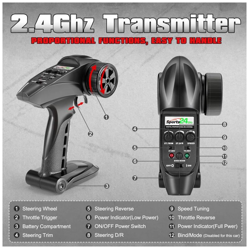 A bateria LiPo de 7,4 V 1600mAh e cabos de carregamento USB fornecidos permitem até 30 minutos de diversão ao ar livre. O carro é montado com pneus Vtread offroad de alta aderência com inserções de esponja e peças plásticas de PA, tornando o mais resistente contra colisões. O corpo de PVC espesso com a folha de decalque DIY permite decorações favoritas. Peças sobressalentes estão disponíveis e a comunicação técnica é facilmente acessível.
