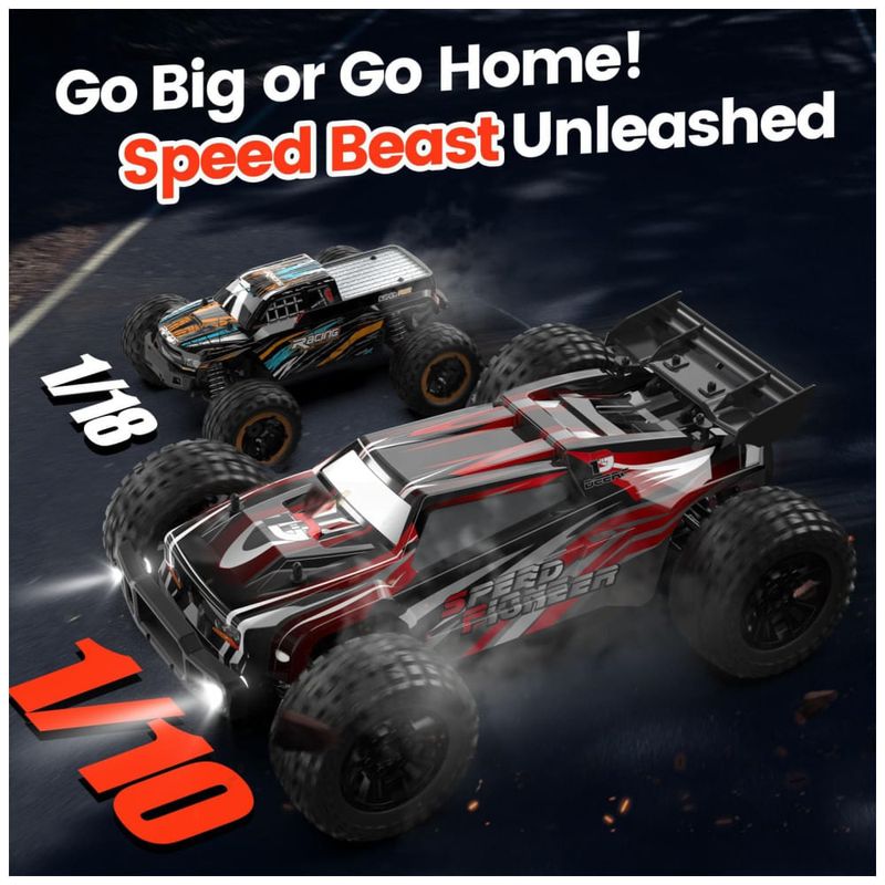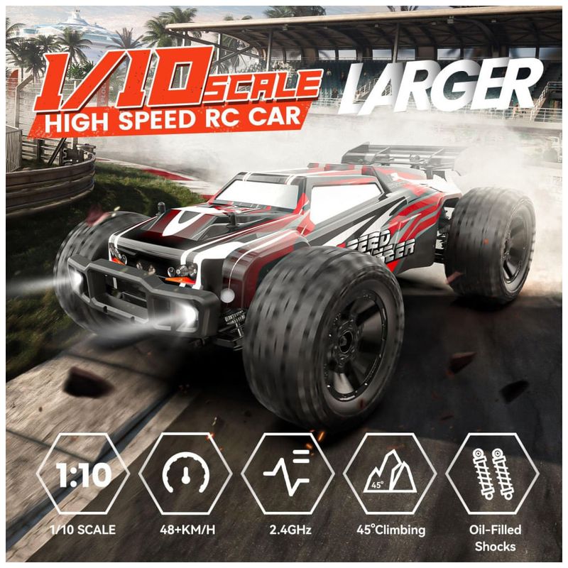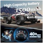 O sistema de controle remoto síncrono de escala completa de 2,4 GHz permite controle proporcional ao acelerador e à velocidade, facilmente ajustável através do interruptor de velocidade e do acabamento da direção. Adequado para usuários iniciantes e avançados, com alcance de até 100,3 metros. As quatro rodas possuem amortecedores cheios de óleo de metal, permitindo condução em todos os terrenos. É um ótimo presente para crianças e adultos, perfeito para corridas em ambientes internos e externos.