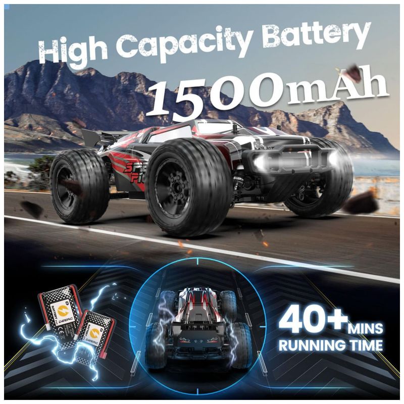 Este carro de corrida RC de alta velocidade 4x4 é ideal para entusiastas de caminhões RC monstros de nível, com componentes duráveis e de alta qualidade. Possui um design bacana da carcaça do carro que chama a atenção e uma carcaça transparente gratuita para personalização. Os faróis de LED permitem uma direção clara mesmo à noite. Equipado com DUAS baterias recarregáveis de alta qualidade 7.4V1500mAh, proporcionando cerca de 40 minutos de diversão por vez 20 minutos por bateria .