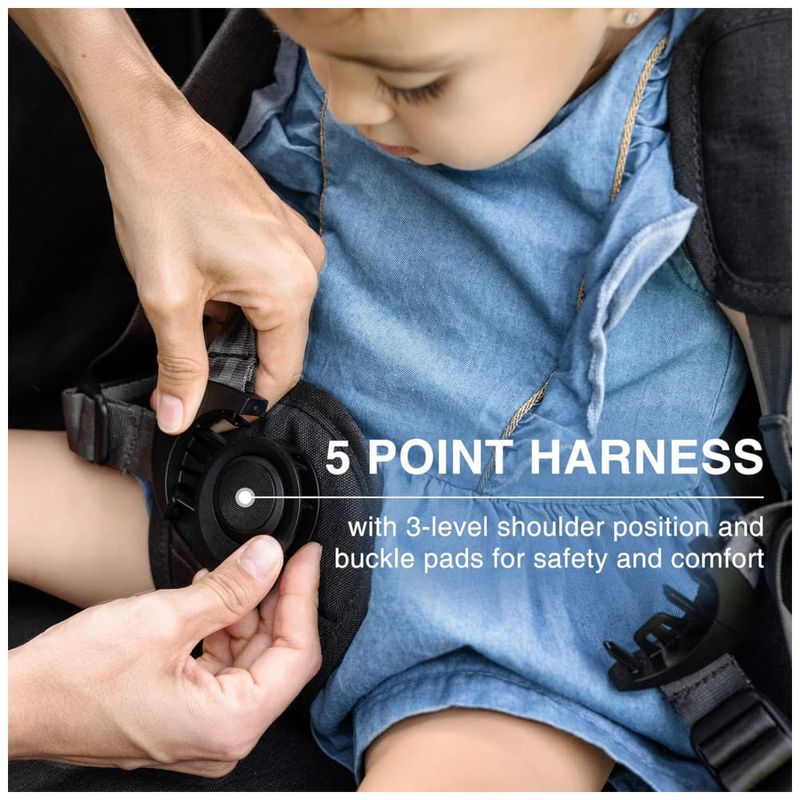 O carrinho é projetado com a segurança das crianças em mente, apresentando um cinto de segurança de 5 pontos integrado e dois assentos face a face, suportando até 49 kg (24 kg por assento). Os freios de pé em cada roda oferecem controle total de rotação de 360° e movimento linear, enquanto a capota UPF 50+ protege a pele sensível dos raios nocivos do sol.