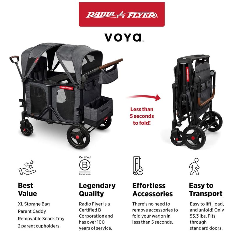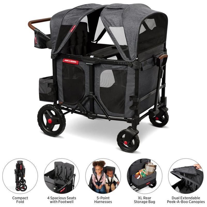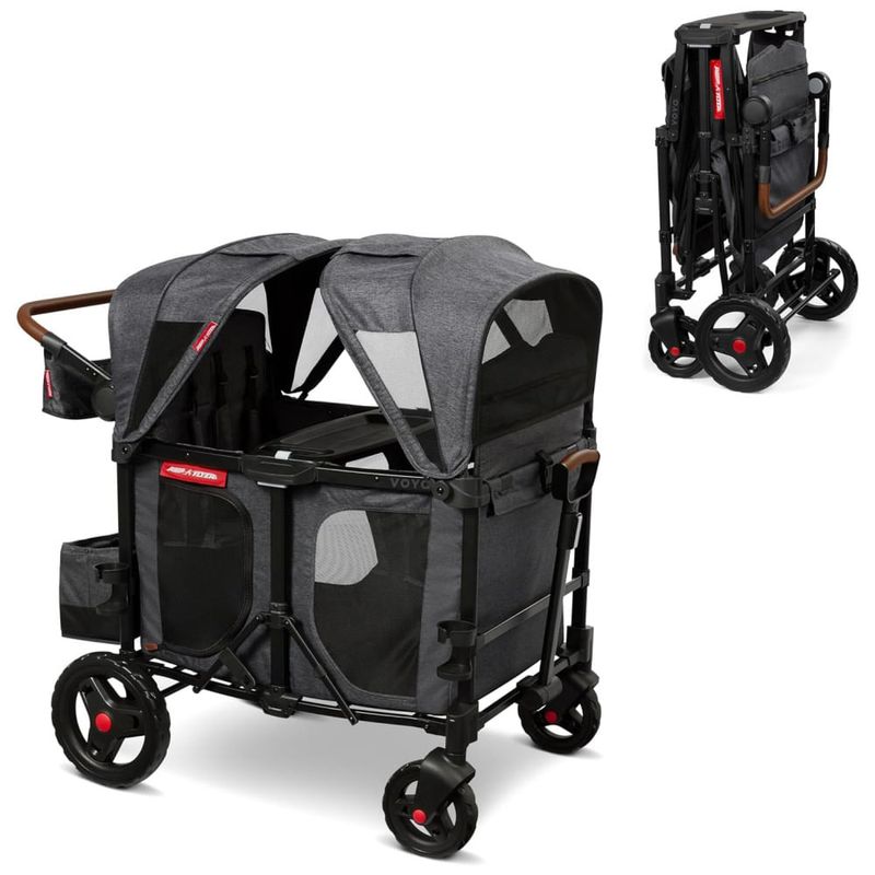 O carrinho é fácil de dobrar e armazenar, sem necessidade de remover os assentos, capotas ou bandeja de lanches. É um produto durável e seguro, atendendo aos padrões de segurança do carrinho e do brinquedo, com capacidade máxima de peso de 136,05 Quilos. As coberturas duplas removíveis com janelas de malha esconde-esconde fornecem proteção UPF.