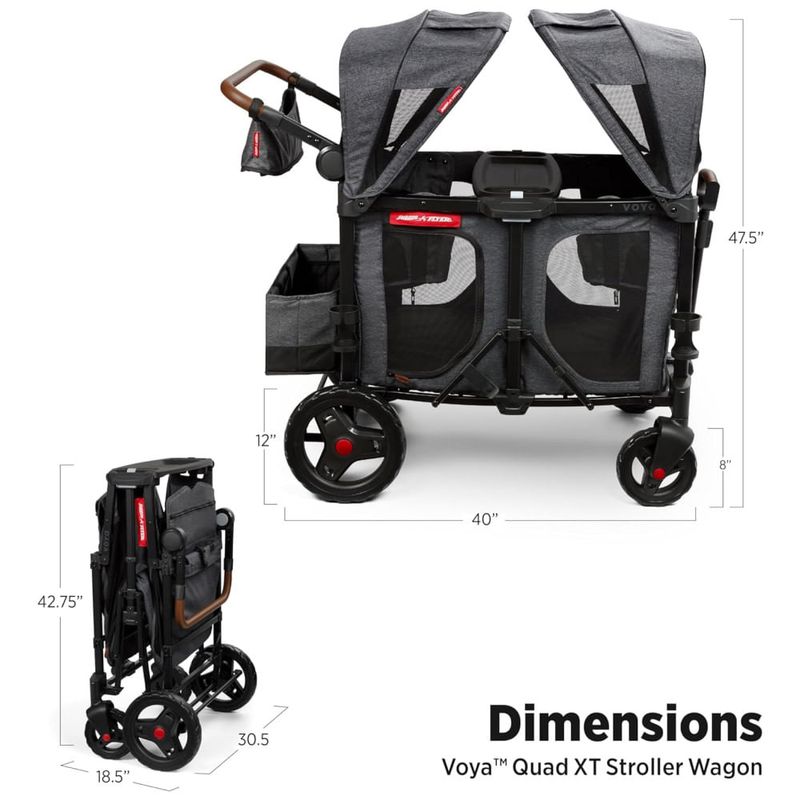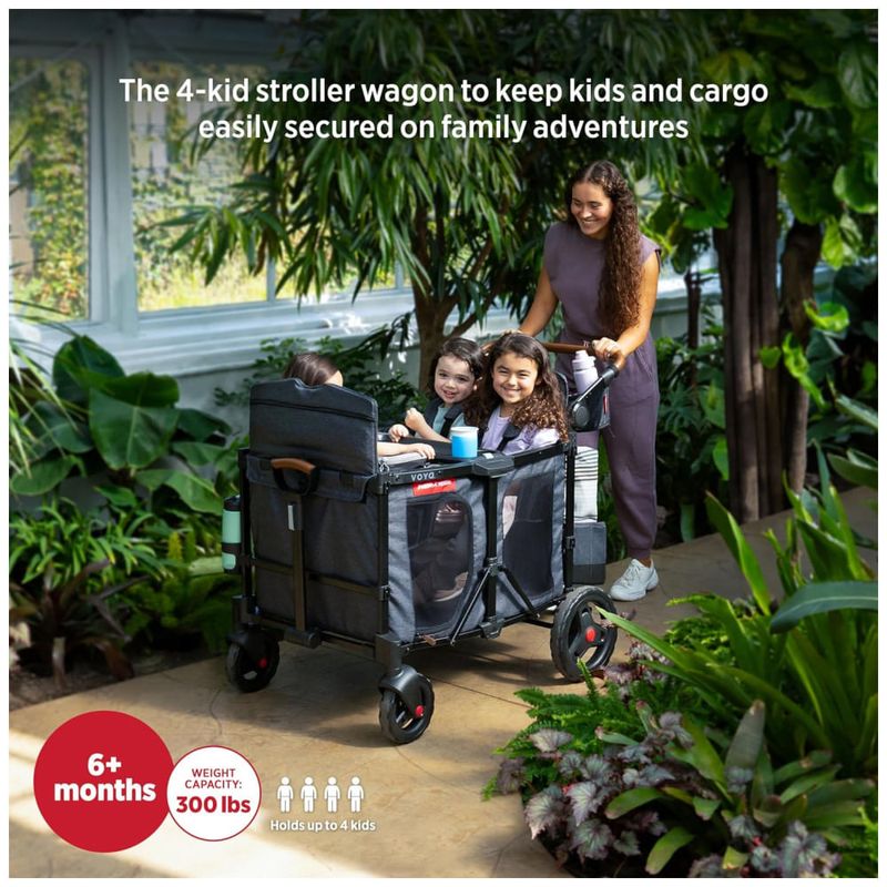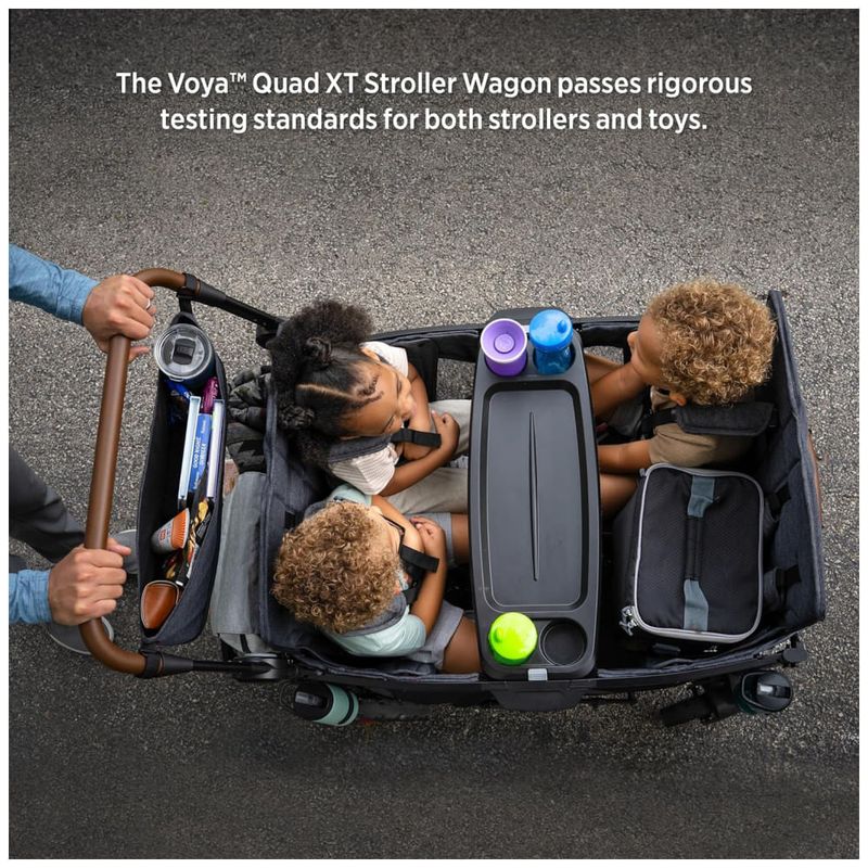 O Voya XT Quad Stroller Wagon é um carrinho de criança versátil e espaçoso, com capacidade para transportar até 4 crianças com conforto e segurança. Suas paredes laterais altas oferecem proteção e privacidade, enquanto as portas laterais com zíper facilitam a entrada e saída dos pequenos. Os assentos suspensos removíveis e o piso acolchoado proporcionam conforto e flexibilidade.