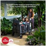 O carrinho vem equipado com acessórios adicionais, como porta-copos montados na lateral, bolsa de armazenamento traseira dobrável e bandeja removível para lanches com porta-copos integrados. A estrutura de alumínio reforçado com aço e o freio de estacionamento traseiro garantem uma condução suave. A alça de empurrar é ajustável em altura com uma pulseira para maior segurança, e a alça Never Fall Pull permanece na posição vertical quando não estiver em uso.