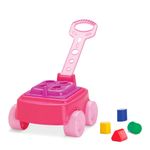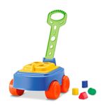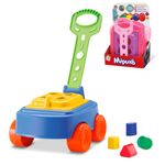 Conta com uma superfície com encaixe para as 4 peças geométricas que o acompanham e alça para puxar, facilitando sua locomoção e ajudando ainda no aprendizado das cores e formas.