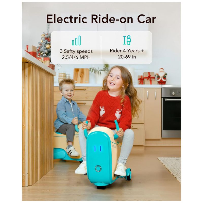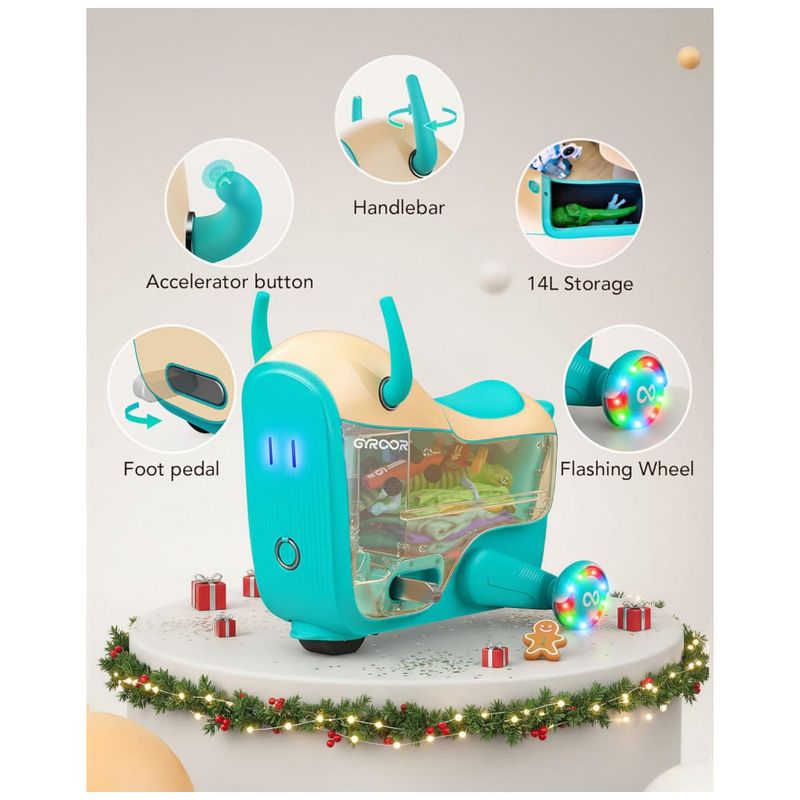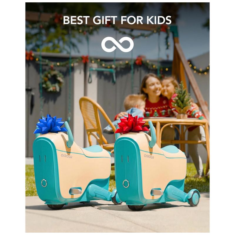 Carrinho elétrico infantil Gyroor GNU projetado para crianças a partir de 3 anos, combinando veículo motorizado e mala de viagem em um único produto para uso em ambientes internos e externos planos. A estrutura compacta integra assento, guidão de controle e rodas com iluminação LED, permitindo deslocamentos em casa, áreas de lazer e terminais de viagem.?