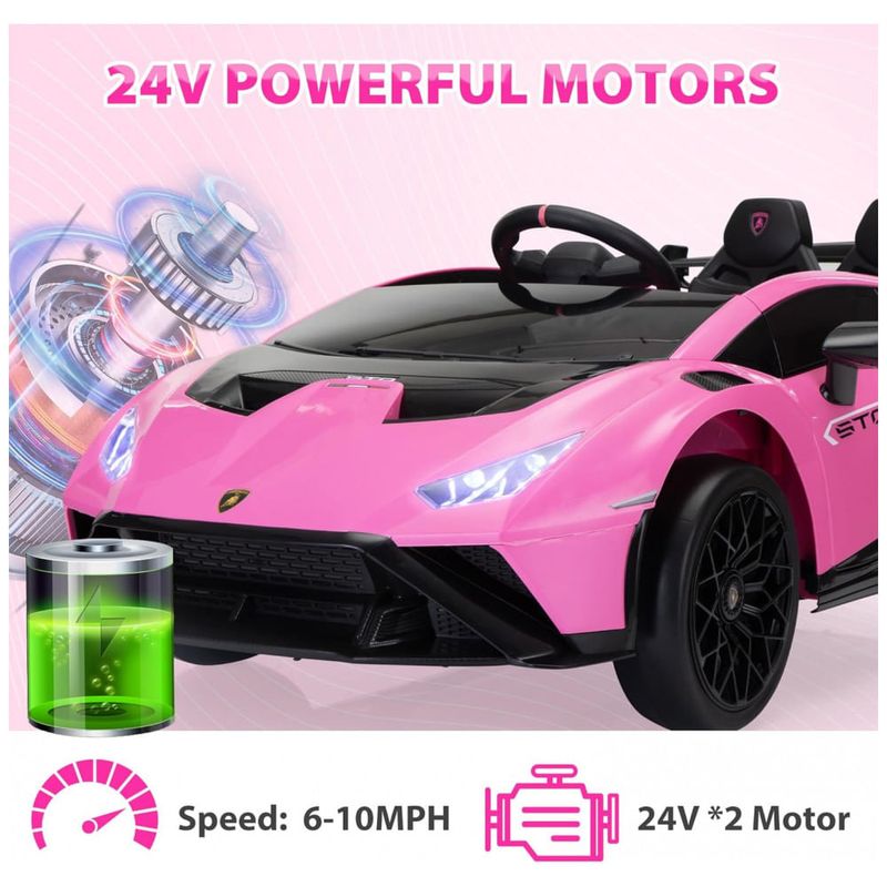Carrinho elétrico Lamborghini TOBBI licenciado, modelo infantil, indicado para crianças de 3 a 8 anos. Equipado com bateria 24V 4.5Ah e dois motores de alta performance 24V (total 2x775), este modelo permite velocidade de até 10km/h e pesa 17,4kg (produto). O modo Drift proporciona curvas rápidas e diversão esportiva em ambientes externos e internos. Assento largo para até 2 ocupantes (máx. 40kg), sistema de suspensão nas quatro rodas, cinto de segurança ajustável e rodas resistentes ao desgaste garantem estabilidade e segurança.