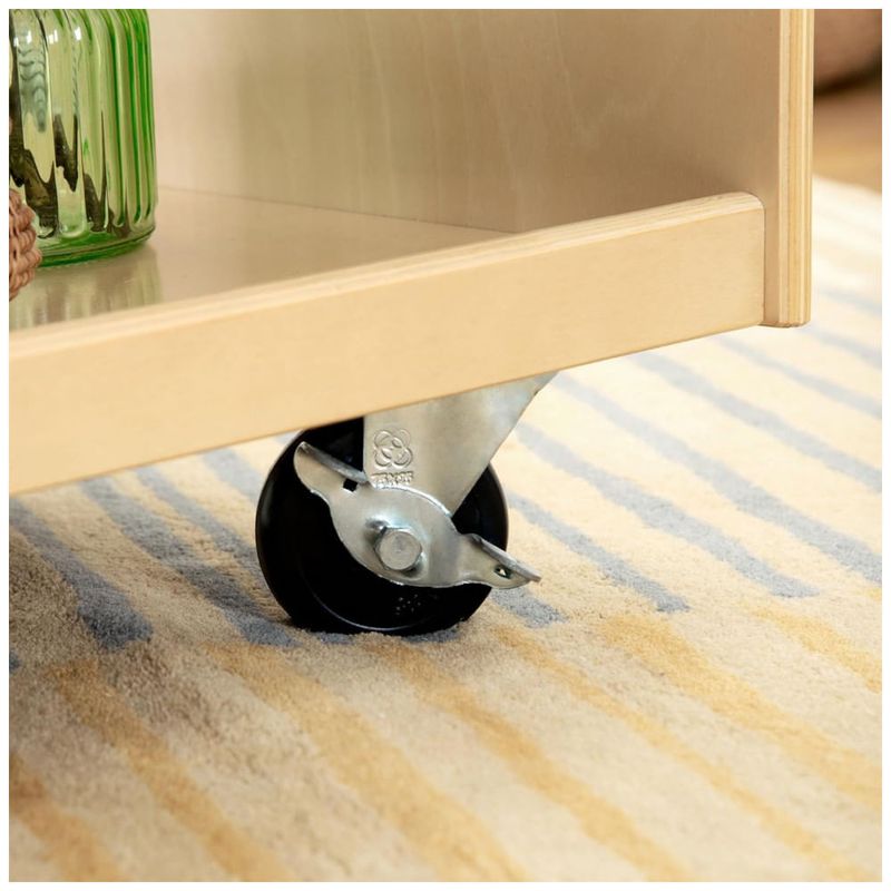 O carrinho conta com puxadores integrados e rodízios resistentes que facilitam o transporte de livros, materiais pedagógicos e suprimentos entre diferentes áreas do ambiente. As prateleiras em altura baixa garantem acessibilidade para crianças, facilitando a escolha autônoma de livros e incentivando o uso constante do acervo.