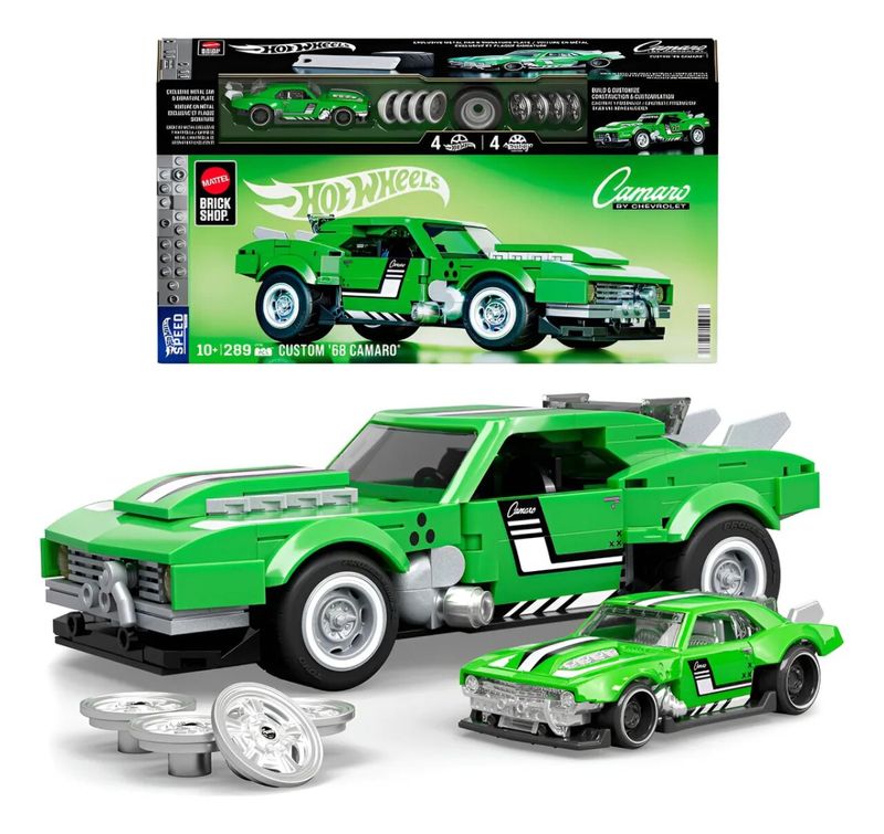 - Carro metálico e placa exclusivos: inclui um carrinho de metal em escala 1:64 e uma placa da marca, disponíveis em primeira mão nos kits Mattel Brick Shop.