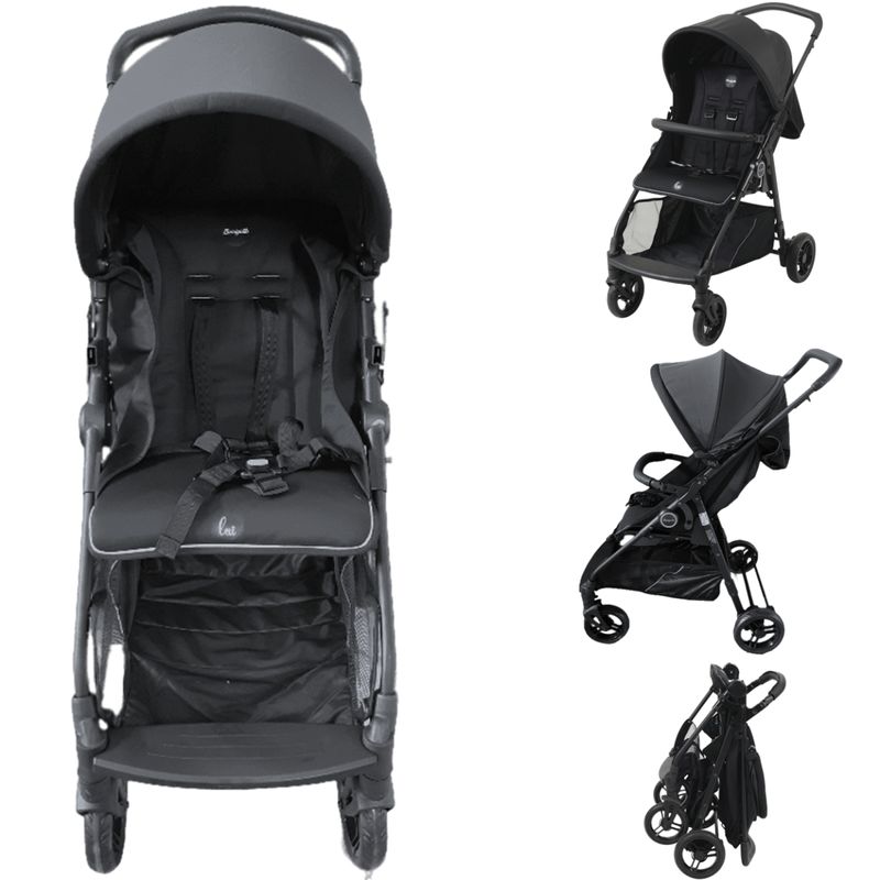 Além disso, o carrinho apresenta fechamento compacto, medindo 78 cm de altura, 55 cm de largura e 45 cm de comprimento quando fechado, facilitando o transporte e o armazenamento.