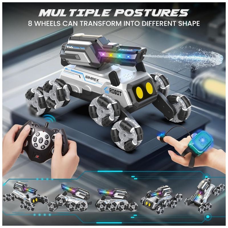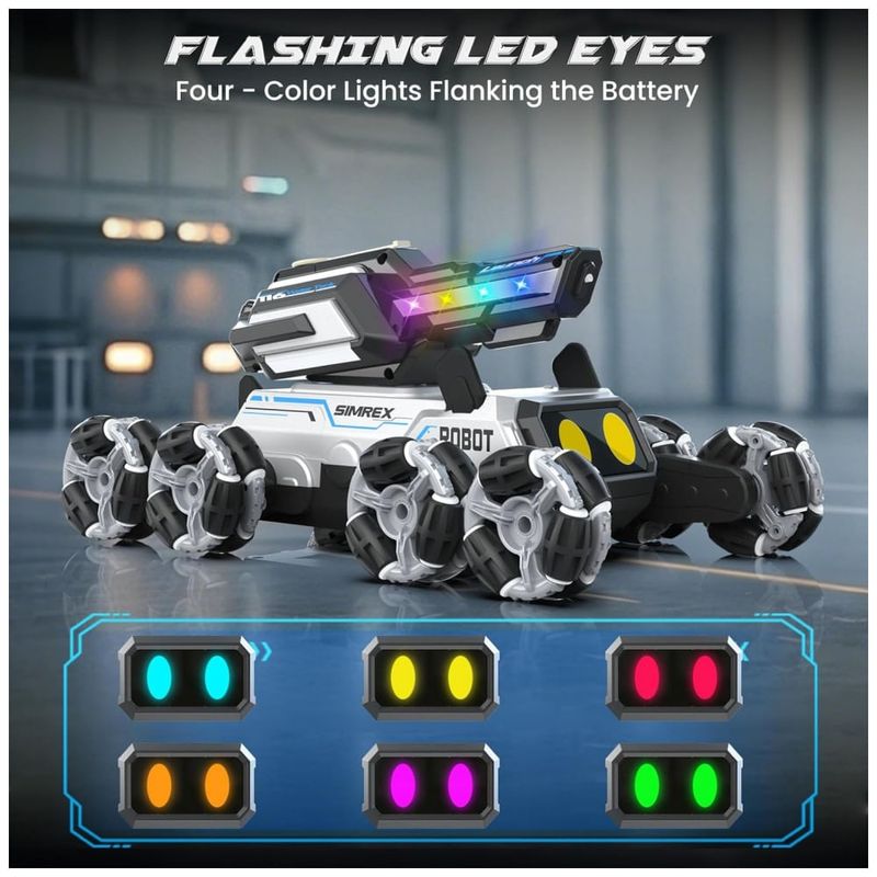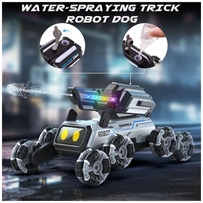 O carrinho robô em formato de cachorro SIMREX TOY2501 utiliza oito rodas com sistema mecanum, permitindo deslocamentos em 360 graus, como movimentos laterais, giros rápidos e manobras acrobáticas em pisos internos. Os olhos em LED RGB alternam cores automaticamente e o módulo superior incorpora uma torre com canhão de água e iluminação lateral em quatro cores. O brinquedo é indicado para crianças a partir de 3 anos, cobrindo uma faixa etária ampla até a adolescência.