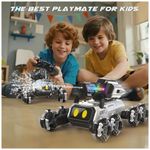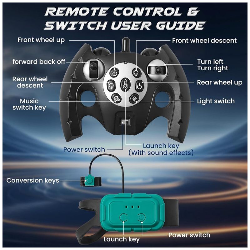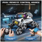 O modelo oferece dois sistemas de controle: controle remoto 2,4GHz para condução tradicional e pulseira de controle por gestos para operação por movimentos de mão. O sistema sem fio proporciona controle estável em distâncias típicas de brinquedos de rádio controle, com comando de aceleração, frenagem, curvas, giros e acionamento da torre de água. Há oito modos de ação com sequências pré-programadas, que combinam mudanças de postura, deslocamentos, giros e efeitos de luz e som.