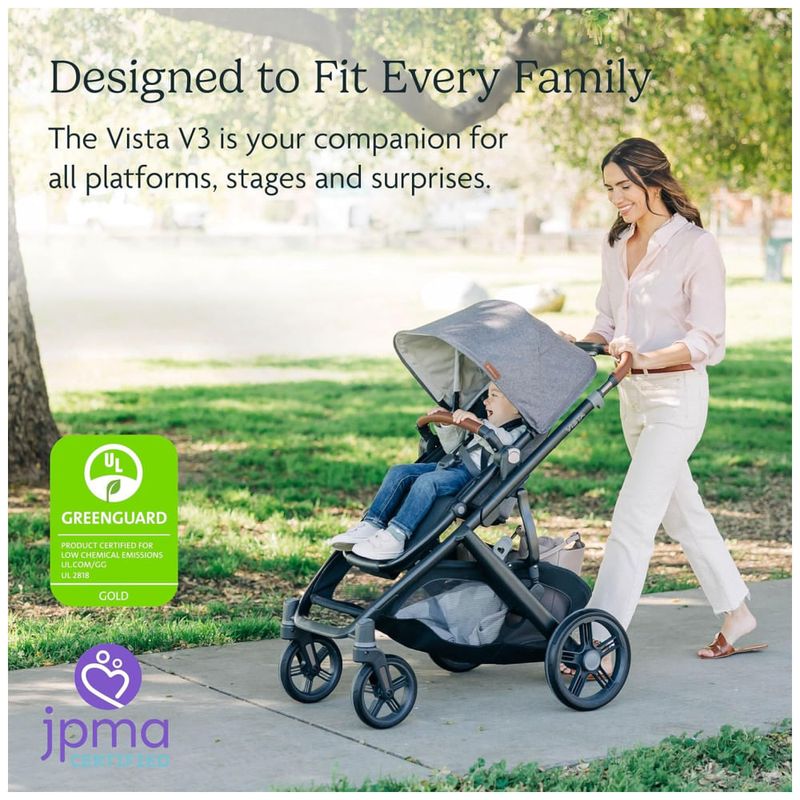 O carrinho de bebê UPPAbaby Vista V3 foi reimaginado para se adaptar facilmente a todas as famílias em crescimento, desde o primeiro filho até o último. Com mais de 30 maneiras de personalizar o passeio, ele começa como um carrinho único e se transforma facilmente para acomodar até três crianças. Oferece portabilidade e conveniência máximas, com um design intuitivo. Possui um toldo extensível, repelente de água, com proteção solar UPF 50 e uma janela para permitir melhor circulação de ar. A espaçosa cesta de acesso fácil suporta até 13,61 kg de peso, permitindo armazenar com facilidade todos os itens essenciais durante o passeio. Seu design premium inclui tecidos de alta qualidade e detalhes em couro certificados pela REACH. Com pneus resistentes, garantindo durabilidade e um passeio suave em vários tipos de terreno. Além disso, conta com trims refletivos nas rodas e na cesta para melhorar a visibilidade. O carrinho pode transportar até três crianças com acessórios extras. Ideal para todas as estações, com um assento de conforto que se ajusta ao clima. Oferece um manuseio fácil com o assento ajustável, um toldo extensível e proteção UPF 50. Certificado GREENGUARD Gold para melhor qualidade do ar. O Vista V3 é o carrinho perfeito para acompanhar o crescimento da sua família, projetado para se adaptar a cada fase, desde o nascimento até ter 3 filhos a bordo.