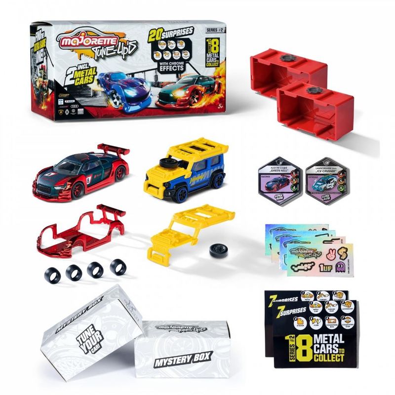 Majorette - Tune Ups Series 2 - Conjunto de 2 peças com 14 surpresas + 4 peças adicionais em cores exclusivas e 2 folhas de autocolantes cromadas extra caixas e adesivos de colecionador. Majorette Tune Ups Série 2, conjunto de 2 peças - a oficina de afinação está aberta! Chamando todos os fãs de carros com 5 anos ou mais: o Tune Ups Series 2 é garantido para mantê-lo entretido! O item de colecionador definitivo.