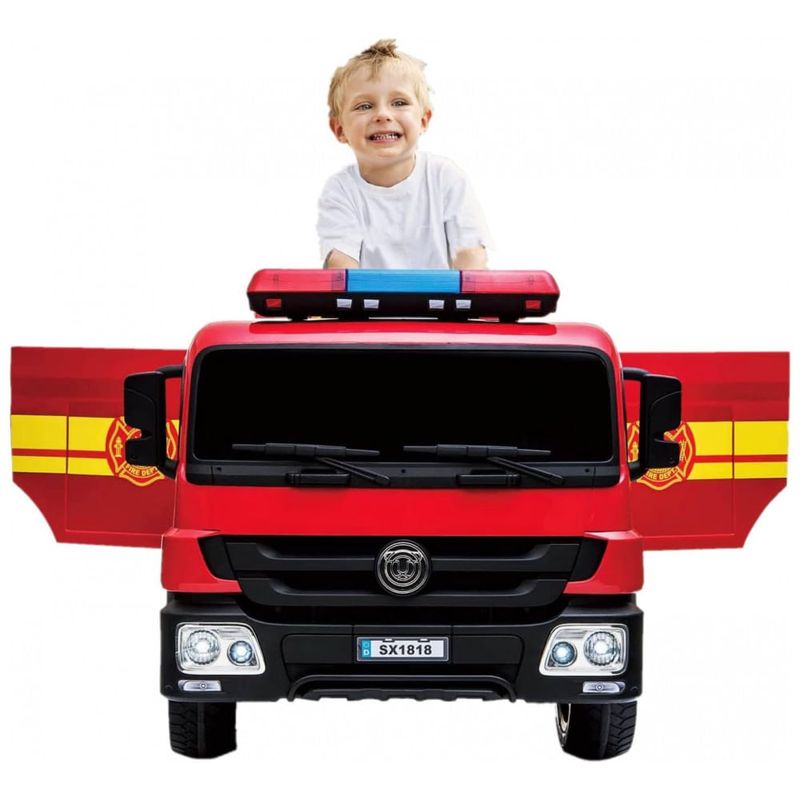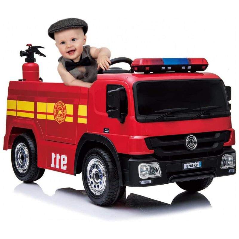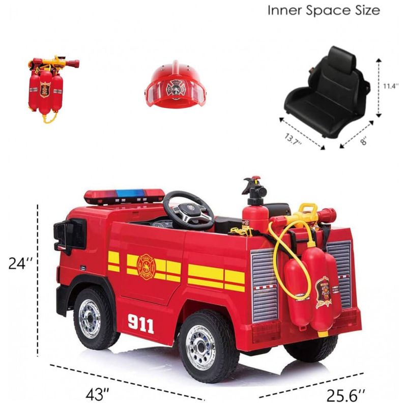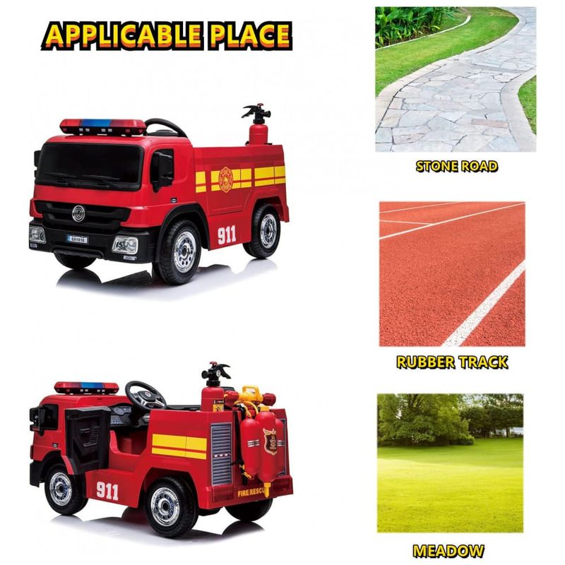 PROJETO MULTIFUNCIONAL Passeio em caminhão de bombeiros, extintor de incêndio simulado, canhão de água e capacete, sirenes realistas, cinto de segurança, portas abertas, pedais elétricos, 5 faróis de LED, entrada e reprodução de MP3. Uma variedade de recursos pode proporcionar ao seu filho uma experiência de condução de caminhão de bombeiros quase real e satisfazer a experiência de bombeiro de vestir o seu filho.