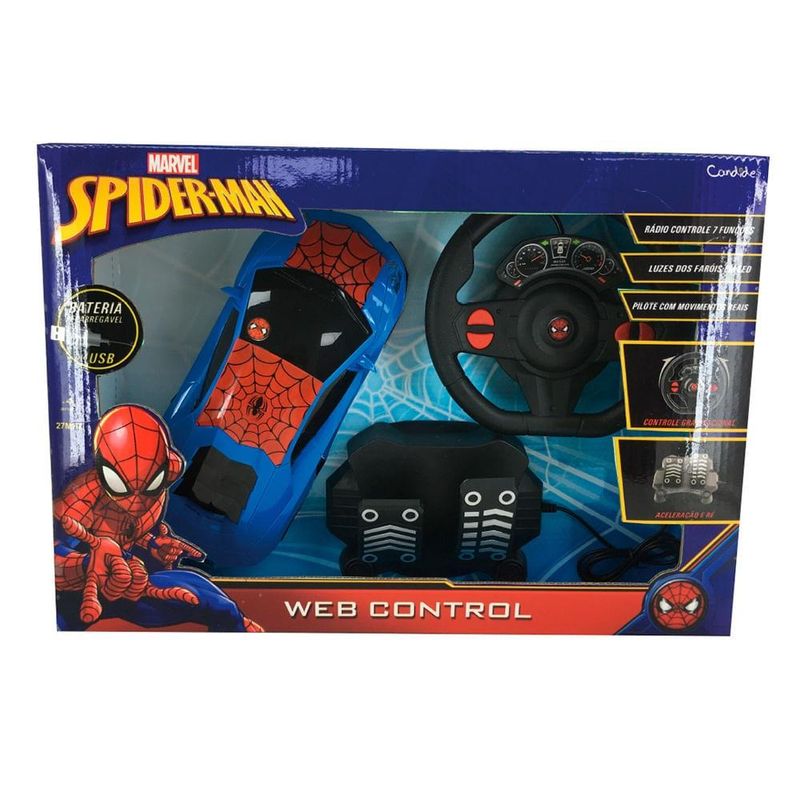 Carro Controle Remoto 7 Funções Spider Man Bat Rec - Candide Veiculo de rádio controle de 7 funções. Utiliza 2 pilhas no controle e 3 pilhas no veículo. Pilhas não inclusas. Possui volante com controle gravitacional e pedais para acelerar e ré. Selo Inmetro: IP-BRI-2598/2021-01
