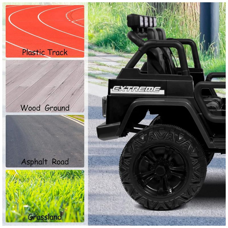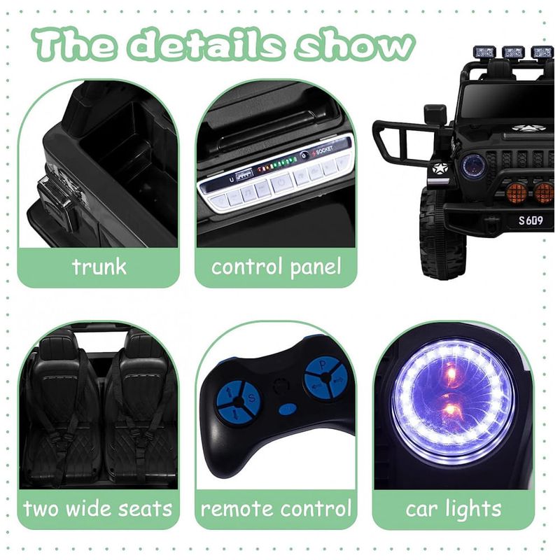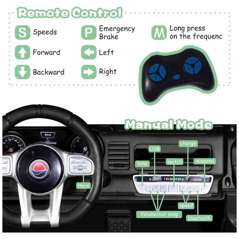 Função realista e atraente Às crianças de 2 lugares de passeio de caminhão equipam se com MP3 player, entrada AUX, porta USB e slot para cartão TF, e também pode ser conectado ao seu dispositivo para tocar música ou histórias, proporcionar aos seus filhos uma experiência real e apreciar sua música favorita a qualquer momento. As funções de avanço e reverso no controle remoto para ajuste, as crianças ganharam mais autonomia e entretenimento durante o jogo.