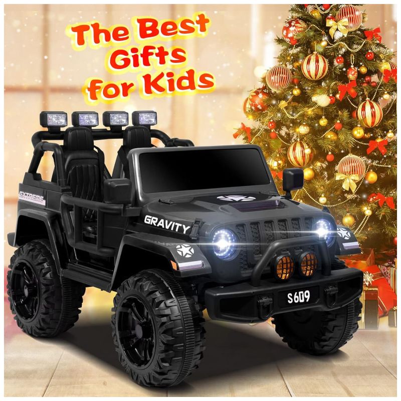 Carro grande de dois lugares O carro infantil de 2 lugares, operado por bateria, apresenta rodas resistentes ao desgaste, feitas de materiais PP superiores, sem possibilidade de vazamento ou explosão de pneus, eliminando o incômodo de inflar. Legal Aparência de design exclusivo, com luzes dianteiras e traseiras brilhantes e porta dupla com trava magnética, este passeio de criança no carro traz uma surpresa extra ao seu bebê, proporcionar aos seus filhos a experiência de condução mais autêntica.