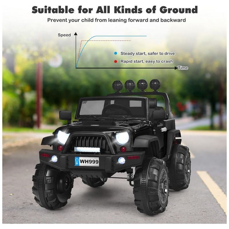 Início lento para garantir a segurança A função de início lento pode impedir que as crianças se assustem com acelerações ou frenagens repentinas. Além disso, um assento mais largo e cinto de segurança garantem a segurança das crianças e as quatro rodas são equipadas com sistema de suspensão de molas para garantir uma condução suave e confortável, ideal para terrenos lisos e acidentados.