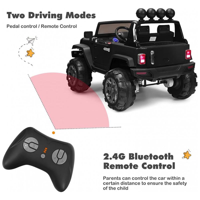 Condução autônoma e controle remoto Este caminhão de passeio de 12V pode ser operado manualmente por crianças por meio de pedal e volante ou por controle remoto pelos pais dentro da distância de caminhada adequada. Os pais podem substituir usando o controle remoto para dirigir o passeio no carro quando o pequeno não consegue alcançar o pedal do acelerador e não está pronto para uma direção confiável ao dirigir ao ar livre.