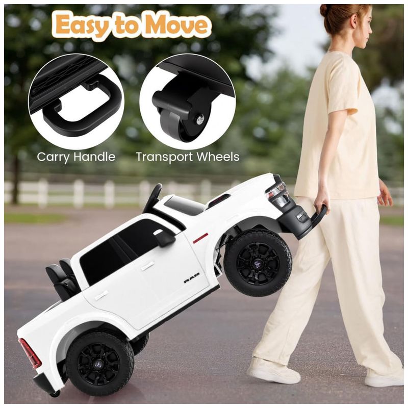 O Costzon Ram 2500 Rebel Licenciado é um carro elétrico infantil premium para até 2 crianças, equipado com dois motores de 100W e bateria de 24V, ideal para experiências de passeio de alto desempenho em áreas residenciais. Oferece velocidade ajustável de 2,2 a 5,2 km/h, controle duplo (operador interno e controle remoto para os pais) com três níveis de velocidade e freio de emergência via controle remoto, garantindo segurança adicional. A suspensão em todas as rodas com 4 amortecedores independentes proporciona condução confortável em vários tipos de piso (asfalto, madeira, bloco, cascalho ou grama), e o sistema "soft start" evita trancos e sustos ao ligar ou desligar.