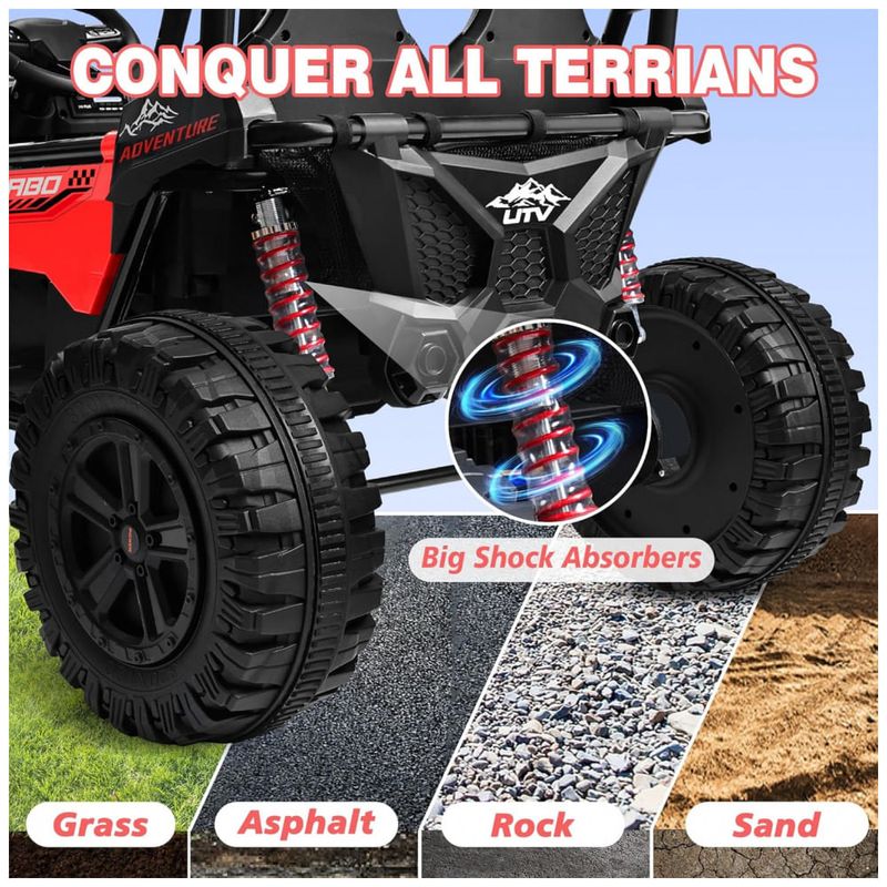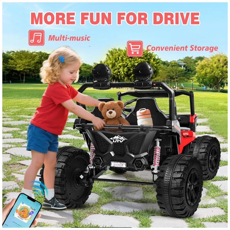 O carro elétrico infantil ANPABO proporciona potência, segurança e diversão para crianças de 3 a 12 anos, com quatro motores de 200W, 24V de potência, suspensão independente com quatro molas e pneus antiderrapantes para todos os tipos de terreno. O modelo possui dois assentos individuais com cintos de segurança ajustáveis, estrutura reforçada em metal, espaço interno ampliado e controle remoto para operação dos pais com três velocidades e parada de emergência. Destaque para os efeitos Rainbow LED, luzes frontais e traseiras, sistema de som integrado, conexão Bluetooth para músicas e histórias, além de compartimento de armazenamento para brinquedos. Capacidade máxima de 63 kg, fácil de montar, e ideal para presente de aniversário ou Natal.