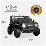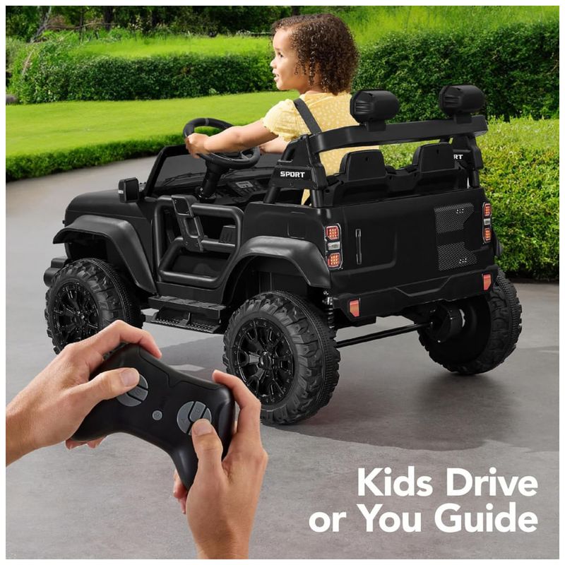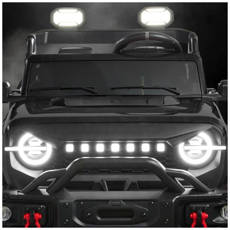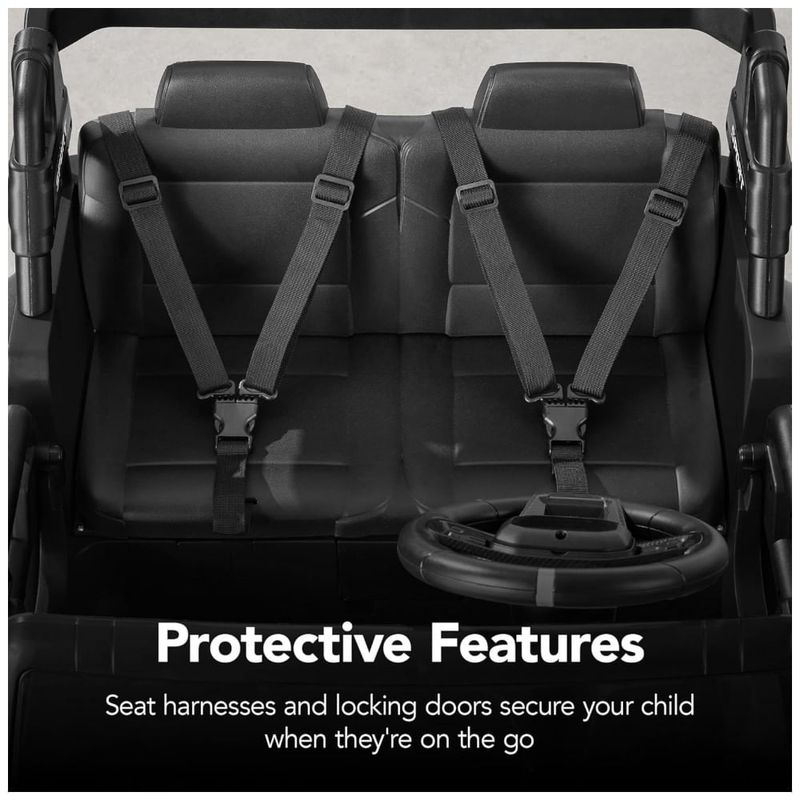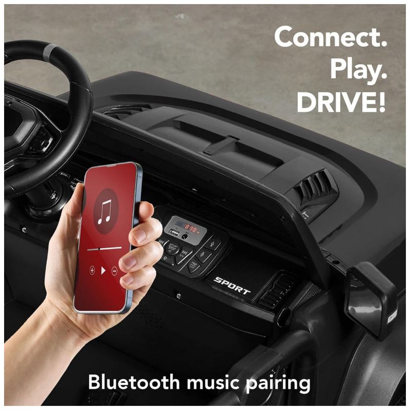 O carro possui sistema de cinto de segurança ajustável para crianças, rodas de plástico com sulcos que proporcionam ótima aderência e suspensão nas duas rodas para um passeio suave. As luzes LED funcionais aumentam a interação, enquanto o sistema de som Bluetooth permite que as crianças ouçam suas músicas favoritas enquanto se divertem.