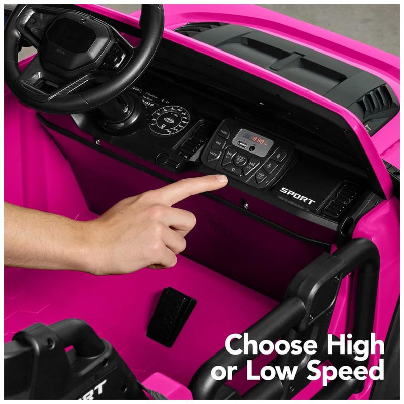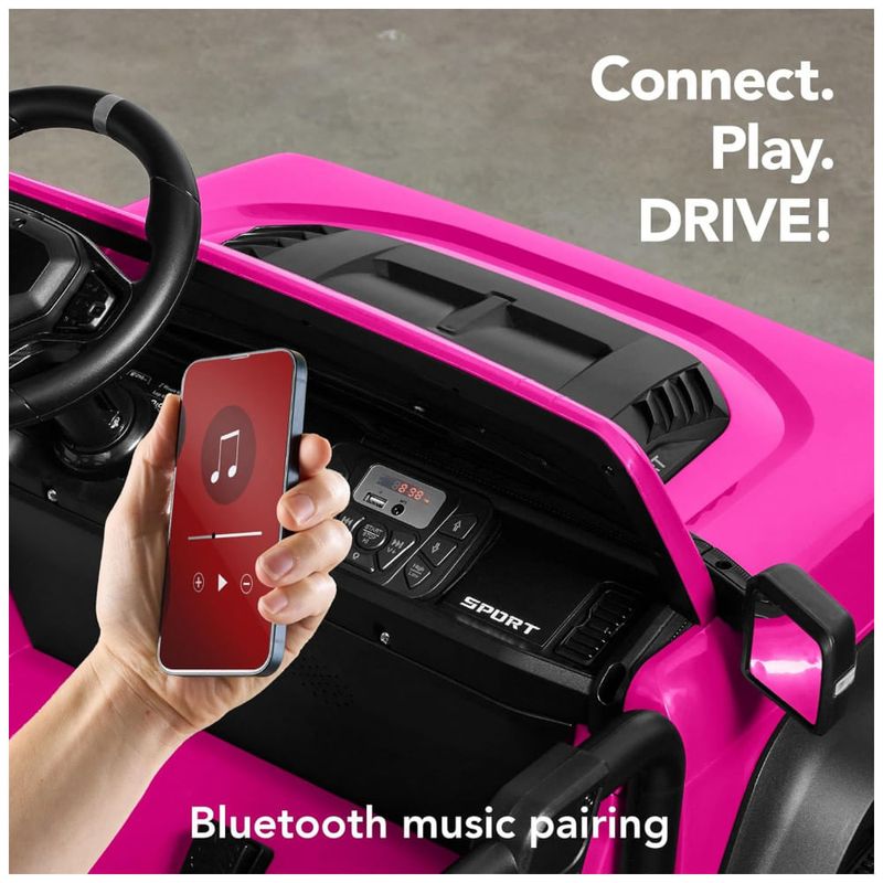 O carro possui sistema de cinto de segurança ajustável para crianças, rodas de plástico com sulcos que proporcionam ótima aderência e suspensão nas duas rodas para um passeio suave. As luzes LED funcionais aumentam a interação, enquanto o sistema de som Bluetooth permite que as crianças ouçam suas músicas favoritas enquanto se divertem.