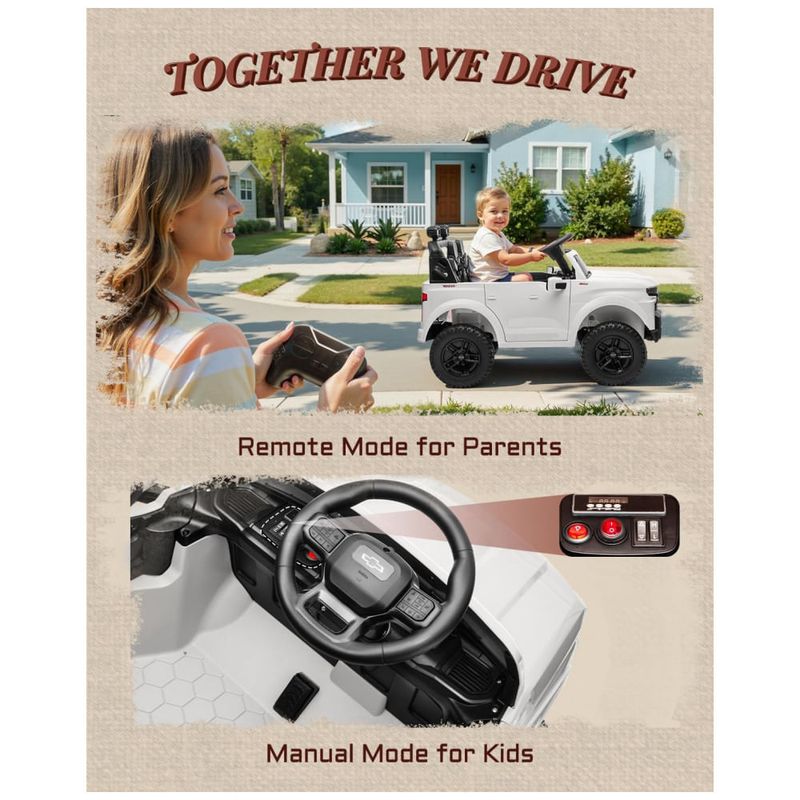 Com controle remoto parental, os adultos podem guiar o passeio a até 30 metros de distância, garantindo segurança total para os pequenos. O sistema de suspensão nas quatro rodas, cintos de segurança de três pontos e portas seguras oferecem estabilidade e tranquilidade durante o uso.