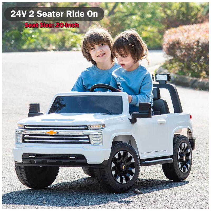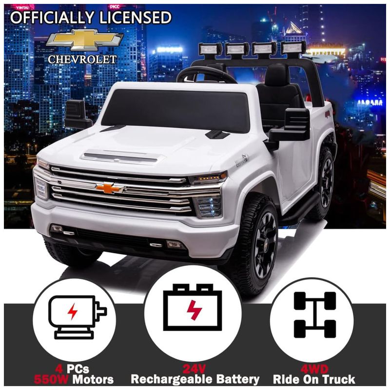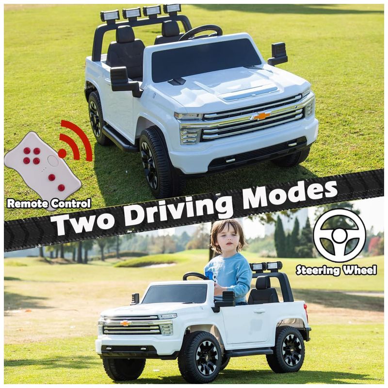 O caminhão é licenciado pela Chevrolet e inclui luzes funcionais, rádio multifuncional e sons realistas de motor, buzina e músicas infantis. Também possui conexões AUX e USB para que você possa reproduzir músicas ou histórias favoritas das crianças diretamente do seu dispositivo.