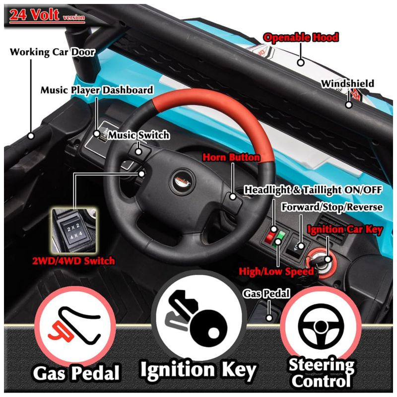 Design Realista e Aventura Off-Road: Com um design inspirado em UTV Off-Road, o carrinho possui partida com chave, cinto de segurança ajustável, luzes LED brilhantes e portas duplas com trava. A estrutura elevada e as rodas à prova de explosão e resistentes ao desgaste garantem um estilo off-road autêntico, permitindo que seus filhos explorem terrenos acidentados com segurança.